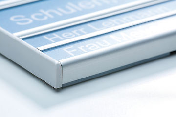 Türschilder, Wegweiser, Lagepläne sind mühelos realisierbar. Text- und Einschubpaneele sind wechselbar und werden mit Folie dauerhaft beschriftet.