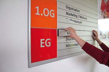 Modulares Paneelsystem für die Innenbeschilderung. Türschilder, Wegweiser und Lagepläne werden aus Text- und Einschubpaneelen gestaltet. Sie sind wechselbar und mitFolie oder Einschubstreifen beschriftbar.